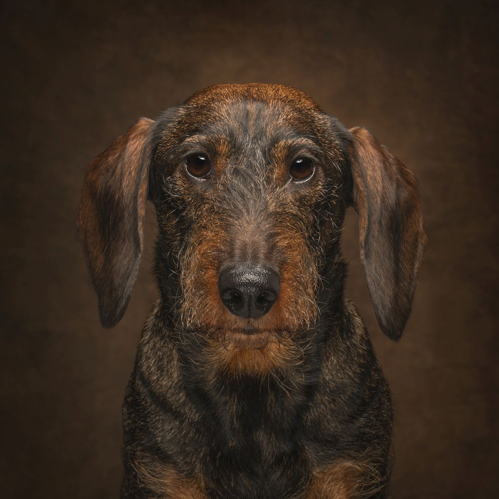 ''I've photographed the stunning Dylan many times over the years. He is a standard wire-haired Dachshund, captured here in a simple headshot with a strong, direct expression. I wanted to focus the wonderful texture of his pin wire coat and those deep chestnut eyes.''
